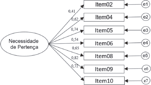 Este estudo objetivou fornecer evidências mais robustas quanto à estrutura da ENP no contexto brasileiro. Primeiramente, optou-se por testar o instrumento com todos os seus dez itens. Contudo, os resultados apontaram que, assim como na análise fatorial exploratória, os três itens com valência oposta apresentaram resultados insatisfatórios. Estes não apresentaram peso suficiente no modelo, baixo poder de explicação e alta variância residual. Tais resultados demonstram que esses itens não seriam relevantes em uma constituição final do instrumento, sendo pouco informativos para o traço latente mensurado e apresentando alta variação externa ao item. Sendo assim, optou-se por excluí-los das análises posteriores. Repetindo-se a AFC, dessa vez com sete itens, foi possível atestar índices satisfatórios quanto a sua unifatorabilidade, corroborando-se a estrutura sugerida pelos autores do instrumento (Schreindorfer & Leary, 1996).