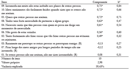 O presente estudo buscou conhecer como a Escala de Necessidade de Pertença se comporta no contexto brasileiro. Por meio de uma análise fatorial exploratória, reproduziu-se a estrutura unifatorial desenvolvida por Schreindorfer e Leary (1996). Contudo, os achados deste estudo indicaram que os três itens reversos do instrumento apresentaram saturações abaixo do ponto de corte recomendado pela literatura (Hair et al., 2015). Pesquisas têm demonstrado que itens que contêm valência oposta têm apresentado parâmetros psicométricos insatisfatórios quando inseridos em instrumentos gerais\unifatoriais (Bond et al., 2011; Credé, Chernyshenko, Bagraim, & Sully, 2009; Schweizer & Rauch, 2008; Spector, Van Katwyk, Brannicj, & Chen, 1997).