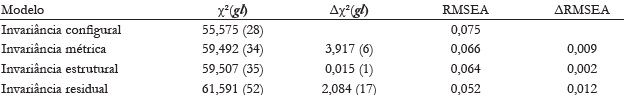 Em seguida, testou-se a invariância do instrumento quanto ao gênero dos participantes por meio de uma AFCMG. Considerou-se o Δ χ2 e ΔRMSEA, os quais devem ser, respectivamente, não significativos e menores que 0,015 (Damásio, 2013). Os resultados encontrados atestam a invariância do instrumento, como pode ser observado na Tabela 2.