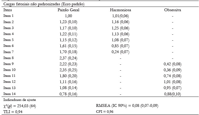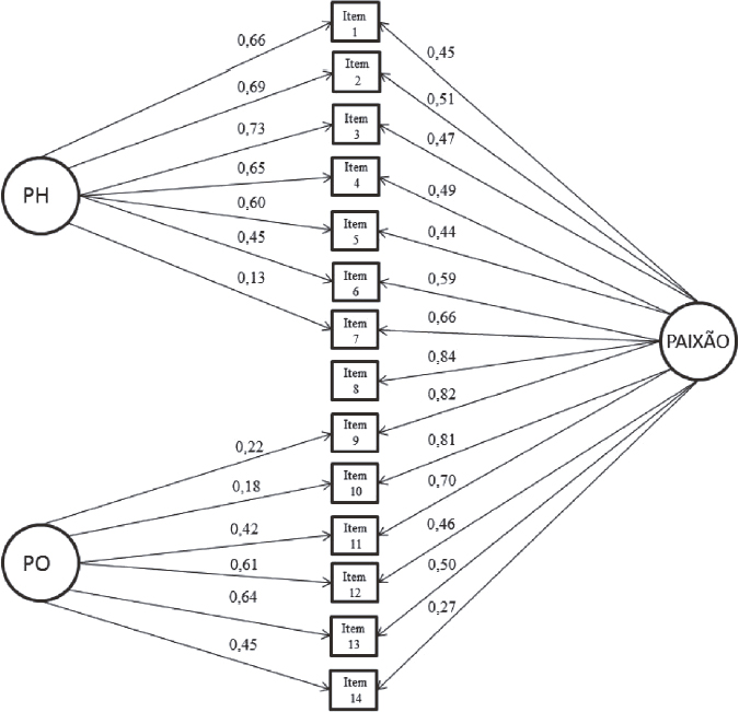 Na Tabela 2, é possível verificar que as médias das cargas fatoriais foram iguais a 0,57, 0,56 e 0,42, para a dimensão geral e para as dimensões específicas (paixão harmoniosa e obsessiva), respectivamente. Para os itens de 1 a 7, a média das diferenças entre as cargas fatoriais da dimensão geral e da dimensão específica de paixão harmoniosa foi igual a -0,04, indicando que os itens contribuem, em média, de maneira praticamente semelhante para a estimação dos escores dessas dimensões. Para os itens de 9 a 14, a média das diferenças entre as cargas da dimensão geral e da dimensão de paixão obsessiva foi igual a 0,17, indicando que os itens contribuem, em média, de maneira levemente superior para a estimação da dimensão geral. Em suma, as cargas fatoriais sustentam a estimação simultânea de uma dimensão geral de paixão pelo trabalho, bem como duas dimensões específicas. Ademais, ressalta-se que as médias das cargas fatoriais em cada dimensão são parecidas entre si, o que oferece sustentação adicional ao modelo bifactor.