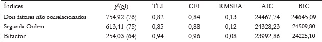Por se tratar de um modelo bifactor, foi ainda analisado o grau em que os escores totais refletem uma variável comum (Rios & Wells, 2014), por meio da variação comum extraída (ECV) e do percentual de correlações não contaminadas (PUC), que foram iguais a 0,57 e 0,60, respectivamente. Tais valores indicam que, embora o modelo sustente uma dimensão geral, é importante estimar a variância remanescente explicada pelas dimensões específicas. As diferenças entre as cargas do modelo bifactor e do modelo unidimensional variaram de 0,01 a 0,25 (média = 0,13), sendo que a diferença de oito cargas (57%) foram superiores a 0,10. Tais resultados indicam que um modelo puramente de um fator tenderia a superestimar a unidimensionalidade dos escores.