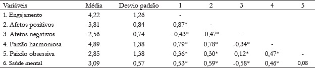 Conforme já mencionado, um dos objetivos do presente trabalho foi reunir evidências iniciais de validade convergente da Escala de Paixão pelo Trabalho (Vallerand & Houlfort, 2003) em amostras brasileiras. Considerando-se que a paixão harmoniosa costuma apresentar altas correlações com o engajamento no trabalho e, consequentemente, maiores níveis de bem-estar (Mageau & Vallerand, 2007; Vallerand, 2012), hipotetizou-se que haveria uma correlação positiva forte entre a paixão harmoniosa e o engajamento no trabalho (H1), os afetos positivos (H2) e a saúde mental (H3). Por outro lado, seria de se esperar uma correlação negativa fraca entre a paixão harmoniosa e os afetos negativos (H4). Considerando-se, ainda, que a paixão obsessiva costuma apresentar correlações baixas a moderadas com o engajamento no trabalho e as emoções negativas (Mageau & Vallerand, 2007; Vallerand, 2012), hipotetizou-se que a paixão obsessiva apresentaria uma correlação positiva moderada com o engajamento (H5) e os afetos negativos (H6), e uma correlação negativa fraca com os afetos positivos (H7) e a saúde mental (H8).