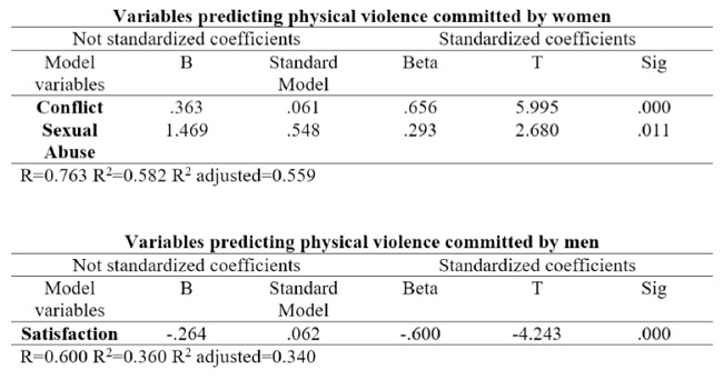 Still, to identify predictors of physical violence, we used regression analysis with the stepwise method. There were two models for the regression (male and female) by inserting the continuous variables that correlated with physical violence perpetrated (dependent variable). Thus the female model included the following independent variables: maternal physical abuse, sexual abuse, maternal psychological adjustment and parental coalition (FBQ), emotional deprivation, mistrust/abuse, social isolation and defectiveness (YSQ), intimacy (TLS), consensus satisfaction and affection (DAS), hierarchy and conflict (FCI). For the male model, the independent variables were: fatherly physical abuse and fatherly psychological adjustment (FBQ), emotional deprivation, abandonment, mistrust/abuse, social isolation and defectiveness (YQS), intimacy and decision/commitment (TLS), consensus, satisfaction and affection (DAS), hierarchy and conflict (FCI).