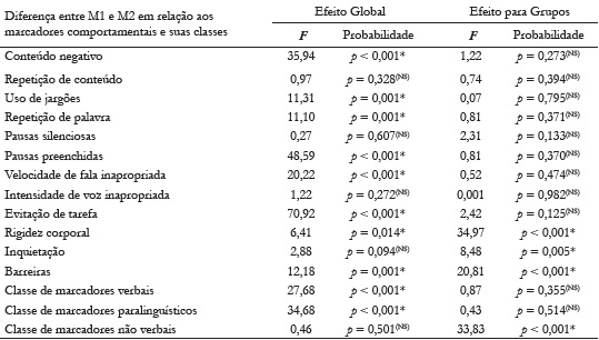 Quanto ao efeito global da tarefa, observaram-se diferenças significativas entre os dois primeiros minutos (M1) e os dois últimos minutos (M2) do discurso para conteúdo negativo, uso de jargões, repetição de palavra, pausas preenchidas, velocidade de fala inapropriada, rigidez corporal, evitação de tarefa, barreiras, classes de marcadores verbais e paralinguísticos. Na comparação dos grupos com e sem plateia, verificou-se que essa diferença foi significativa para rigidez corporal, inquietação, barreiras e classe de marcadores não verbais. Para o grupo com plateia, a diferença entre M1 e M2 foi significativa apenas para rigidez corporal e classe de marcadores não verbais (Z = -2,66; p = 0,008 e Z = 3,84; p < 0,001, respectivamente), com aumento da frequência de ambas as categorias para os dois últimos minutos do discurso. Em contrapartida, no grupo sem plateia, a diferença foi significativa para rigidez corporal (Z = -4,19; p < 0,001), inquietação (Z = -3,26; p = 0,001), barreiras (Z = -3,75; p < 0,001) e classe de marcadores não verbais (Z = -3,44; p = 0,001), com diminuição da frequência durante os dois últimos minutos do discurso para todas essas categorias.