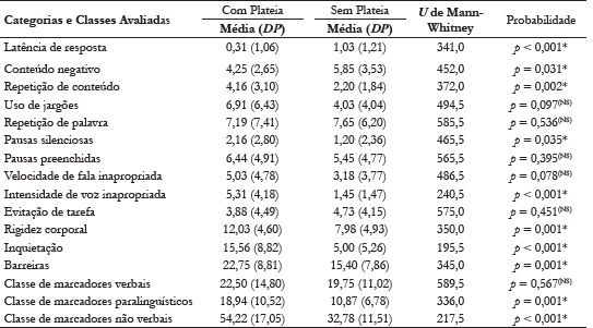 No geral, os grupos diferiram significativamente em relação à maioria das categorias e classes avaliadas: latência de resposta, conteúdo negativo, repetição de conteúdo, pausas silenciosas, intensidade de voz inapropriada, rigidez corporal, inquietação, barreiras, classes de marcadores paralinguísticos e não verbais. Com exceção de latência de resposta e conteúdo negativo, o grupo com plateia exibiu uma média de frequência significativamente mais alta para todas as demais categorias e classes. Embora as diferenças de médias para uso de jargões, pausas preenchidas, velocidade de fala inapropriada e classe de marcadores verbais não foram estatisticamente significativas, o grupo com plateia apresentou valores maiores em comparação ao grupo sem plateia.