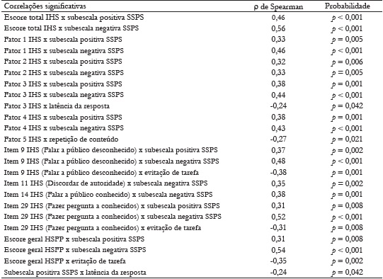 Verificou-se que o escore total, os itens 9, 29, o escore geral de HSFP, e os Fatores 1, 2, 3 e 4 do IHS-Del-Prette se correlacionaram positiva e significativamente com a subescala positiva e negativa SSPS. Além disso, a subescala negativa da SSPS correlacionou positiva e significativamente com os itens 11 e 14 do IHS. No que se refere às categorias de análise do TSFP, foi constatado que latência de fala se correlacionou negativa e significativamente com o Fator 3 do IHS e com a subescala positiva do SSPS. Para a categoria evitação de tarefa, foram encontradas correlações negativas e significativas com o item 9, 29 e o escore geral da HSFP. A categoria repetição de conteúdo se correlacionou negativa e significativamente com o Fator 5 do IHS.