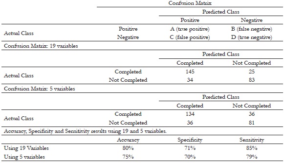 Table 1 presents the Confusion Matrix, Confusion Matrix using 19 variables and Confusion Matrix using 5 variables, as well as the Accuracy, Sensitivity and Specificity results using 19 and 5 variables. The 19 variables that entered the model of final academic performance were: period of the course, area of the course, course, year of the course, marital status, whether dating or not, type of housing, gender of the respondent, age of the respondent, working or not, six behavioral categories of social skills (QHC-University Students, IHS-Del Prette), measure of mental health (SCID-IV) and two initial measures of academic performance. The analysis with five variables included: area of the course, year of the course, gender of the respondent, initial academic performance and final academic performance.