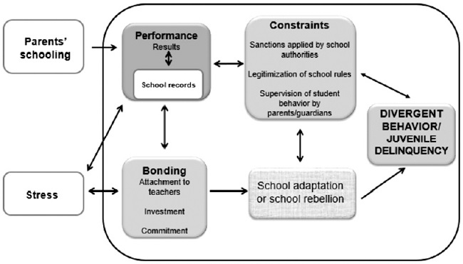 LeBlanc (2003, 2006) emphasizes that investigations on the relationship between school experience and juvenile delinquency are less numerous when compared, for example, to those that focus on aspects of family functioning. The evidence, derived from research carried out through different methods and in different sociocultural contexts, is in line with the propositions inherent in the Theory of Control of Conduct “in and by the school.” They indicate that school experience characterized by low performance (Calejon, 2017) and delay (associated with a sense of incompetence and lack of motivation) (Bazon et al., 2013), low investment in school activities, absenteeism and dropout educational aspirations) (Destro & Souza, 2012; Silva et al., 2016), denote school dissociation. Similarly, they indicate that students’ difficulties in interacting with peers and teachers (Bazon et al., 2013) and the fact that they are often punished by the school (Cornell, 2013; Esterle-Hedibel, 2006), are associated risk factors conduct. Some studies demonstrated that negative school experience is one of the most important predictors of juvenile offender involvement (Geib, Chapman, D’Amaddio, & Grigorenko, 2011; Zhang et al., 2010).