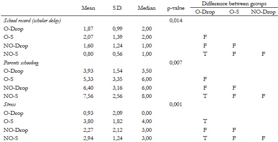 Another contextual variable influencing the conditions under which the school control mechanisms operate is the “stress” experienced by the adolescent in school. The results showed that the highest average level of stress would be in O-S group, indicating that they would have a school experience associated with tension, the feeling of being “watched” and also the fear of not being able to “perform well” in school. This result also suggests a more significant vulnerability in this group regarding the conditions in which school control takes place, considering that one way to reduce stress and frustration in school is to drop out it (Esterle-Hedibel, 2006). With slightly lower levels of stress, we have the groups formed by NO-S and NO-Drop adolescents, indicating that schooling for them represents a challenge.