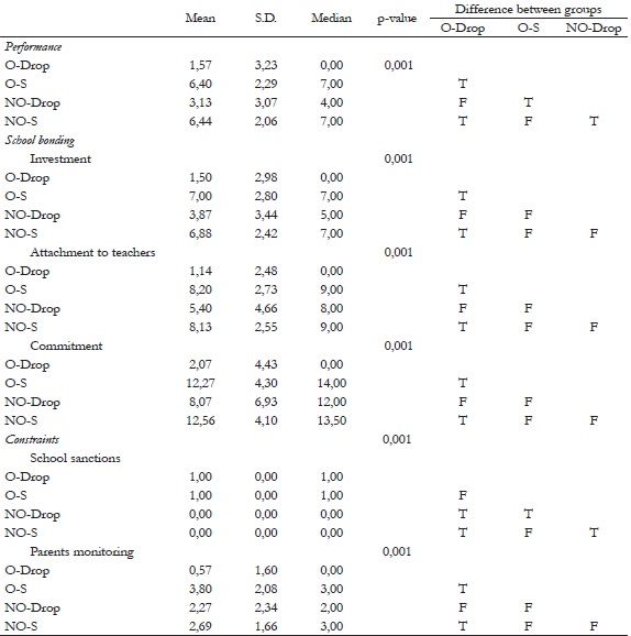 Regarding “school bonding” it is evaluated by the results of the following components: “investment,” “attachment to teachers,” and “performance.” The adolescent non-offender students, in general, presented the highest means when compared to the dropouts, considering the data they submitted before quitting school. However, the comparisons indicated significant differences (p <0.05) only between the groups composed of the offenders (O-Drop and O-S) and between O-Drop and NO-S in three linkage components.
