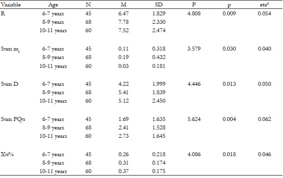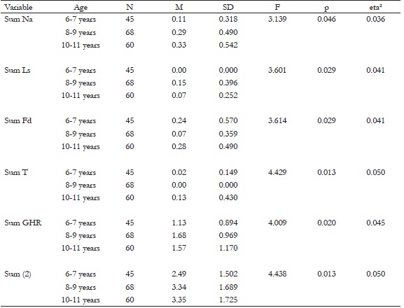 In Table 1, we see that children aged 6 and 7 years were less inclined to productivity (R) when compared to older children. Children of this group also showed a less practical and concrete way to grasp the reality in answering the task (D) when compared with 8 and 9 year olds and a smaller number of unusual responses (FQu) in relation to children of 10 and 11 years, suggesting a less subjective way of understanding the facts (Xu%). The group of children aged 10 and 11 years showed a lower rate of unintentional mental activity in relation to the group of children 8 and 9 years (ma).