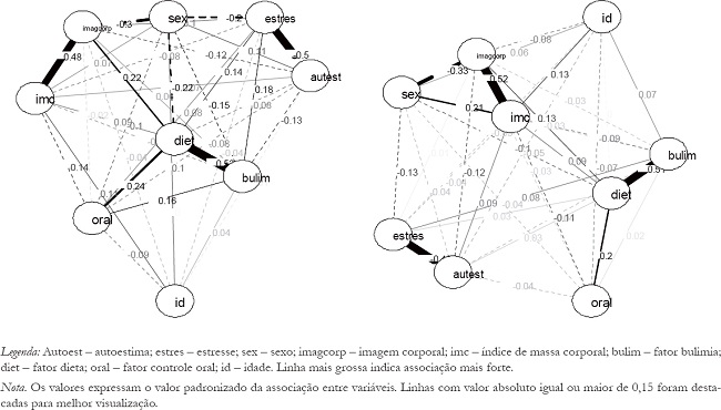 Outros estudos afirmam que jovens com bulimia apresentam excesso de peso (Alvarenga et al., 2011; Gomes et al., 2010; Rossi, Moreira, & Rauen, 2008). Importante notar nesse contexto que meninas são mais propensas a apresentar transtornos alimentares (Alvarenga et al., 2011; Lima et al., 2012; Scherer et al., 2010), resultado também observado nesta pesquisa, sendo que o comportamento alimentar inadequado foi identificado em 34 meninas (23%), contra 12 meninos (13,2%). Além disso, essa relação também foi observada na análise de rede, em que o sexo foi fortemente relacionado ao fator dieta e indiretamente relacionado aos fatores bulimia e controle oral.