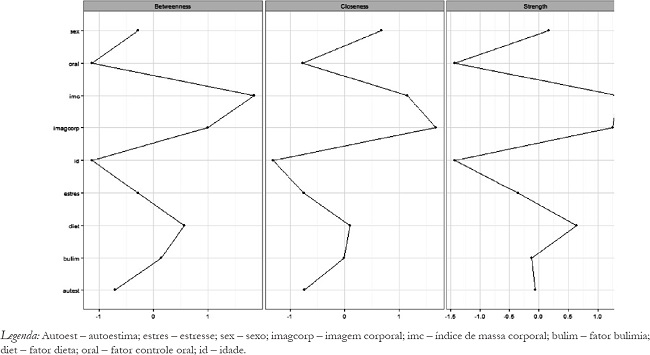 É possível observar que o IMC foi a variável com maior betweeness (conectividade), ou seja, é a variável que mais faz ligações com outras. A imagem corporal apresentou mais closeness (proximidade), possuindo menor distância das outras variáveis porque representa o número de conexões observadas em razão de todas as possíveis. O IMC e a imagem corporal tiveram mais strength (força), já que possuíram as correlações mais fortes com as demais variáveis do sistema (Figura 2).