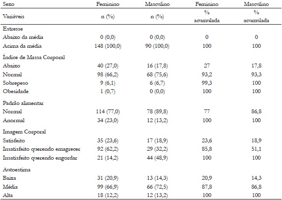 É possível perceber que todos os participantes estavam com estresse acima da média da população norte-americana e sul-brasileira. A maioria das meninas estava dentro do peso normal, com IMC na faixa normal; mas houve, mais meninas abaixo do peso, comparando com o percentual de 17,8% dos meninos (Tabela 1).