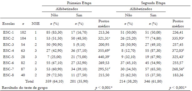 Por meio da categorização alfabetizados e não alfabetizados, foi possível observar que, a partir da amostra total deste estudo (N = 560), a taxa de estudantes alfabetizados no final do segundo ano foi de 61,80% (n = 346). A Tabela 1 apresenta a frequência e a porcentagem de estudantes nas duas categorias, divididos por escolas com sua faixa de NSE, o resultado dos testes de Kruskal-Wallis, U de Mann-Whitney e os postos alcançados pelos grupos.