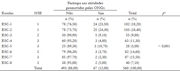 A apuração dos alunos vinculados a ONGs indicou que, na ESC-1 e ESC-2, concentravam-se o maior número de participantes das atividades extracurriculares. A investigação da associação entre NSE e participação nas ONGs indicou que quanto menor o fator econômico da escola, maior o número de estudantes vinculados às instituições sociais (p < 0,001). Esse resultado se repetiu na apuração, considerando os três NSEs. Na Tabela 2, estão as frequências de participantes nas ONGs, divididos por escolas, com seus respectivos NSEs, e o resultado do teste de qui-quadrado.