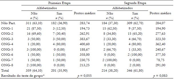 A Tabela 3 apresenta a frequência de estudantes divididos entre as categorias não alfabetizados e alfabetizados agrupados entre não participantes e participantes das ONGs, pelas organizações frequentadas e os postos alcançados nas análises. Entre os frequentes nessas atividades, 55,20% terminaram o ano alfabetizados. A taxa de alfabetizados, entre os participantes das ONGs, comparada com os não participantes, é menor em 6,80%. A investigação sobre o desempenho escolar pesquisou a existência de diferença entre os estudantes divididos entre não participantes e participantes, considerando a amostra total e, nas entidades com no mínimo cinco estudantes, em sintonia com os critérios das análises estatísticas realizadas, e não participantes e participantes divididos por ONGs. Nenhuma dessas análises destacou diferença significativa entre os grupos (p > 0,050).