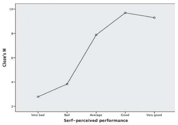 In the case of elementary school, the post-hoc Tukey test showed that the difference in Cloze score was among the students who self-assessed as Very Bad (M=2.7) and Average (M=7.8) (p=0.001), and Very Bad and Good (M=9.6) (p = 0.001) and Very bad and Very good (M=9.3) (p=0.001). There was also a difference between those self-perceived as with Bad performance (M=3.8) and Average (M=7.8) (p=0.001), Bad and Good (M=9.6) (p=0.001) and Bad and Very Good (M=9.3) (p=0.001). Figure 1 shows the data of the elementary school students.
