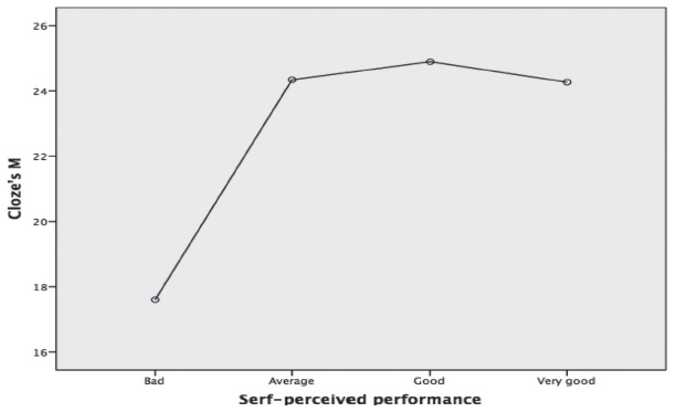 The post-hoc Tukey test showed that the difference in Cloze score was among the students who self-assessed as Bad (M=17.6) and Average (M=24.3) (p=0.013), Bad and Good (F=24.3) (p=0.005) and Bad and Very good (F=24.9) (p=0.045). Figure 2 shows the data of the middle school students.