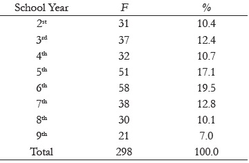298 students enrolled in four public schools in the states of São Paulo (66.4%, n=198) and Paraná (33.6%, n=100). The average age was 11.7 years (SD=2.0), the minimum age was 8 years and the maximum 16. The girls represented 51.3% of the sample (n=153) and boys 48.7% (n=145). The distribution of students by school year can be seen in Table 1.