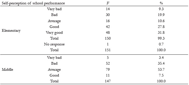 In the group of elementary school one can observe that the average reading comprehension was 7.58 (SD=3.5). The minimum score was 0 and the maximum 15 points. For the middle school grades we found that the average reading comprehension was 24.4 (SD=4.8). The minimum score was 0 and the maximum 33 points. Table 2 shows the results related to the perception of school performance of students of the elementary and middle schools.