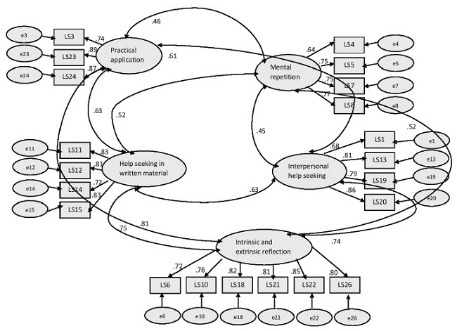 The correlated five-factor model seems to better adjust to data. Therefore, we re-specified this model based on modification indices indicated by AMOS. This procedure is a post-hoc analysis that uses confirmatory factor analysis in exploratory mode. We separately evaluated correlations between errors for each factor and gradually withdrew items based on psychometric criteria (statistics and content). These modifications were associated to the factors of intrinsic and extrinsic reflection, interpersonal help seeking and seeking help in written material. Overall, we eliminated five items (LS2, LS9, LS16, LS17, LS25), reducing the original scale to 21 items (Figure 1).