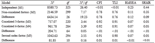 Table 1 presents the adjustment indices of the five suggested models. Strictly speaking, the indices did not present a good fit as recommended by Weston et al. (2008).