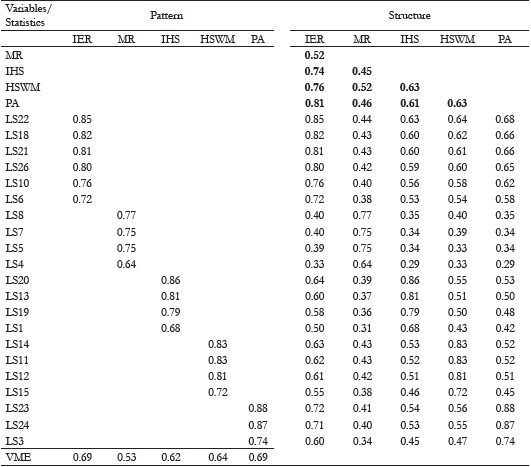 Adjustment indices for the re-specified correlated factor model can be observed in Table 2. This Table also shows standardized pattern and structure parameters for the model. With Χ2 = 510.96, df = 142, Χ2/ df = 2.86, CFI = 0.95, TLI = 0.94, RMSEA = 0.06, SRMR = 0.05, our final model (M6) indicates a good fit to the data. Further, composite reliability for the five factors (IER CR = 0.93; MR CR = 0.82; IHS CR = 0.87; HSWM CR =0.88 ; PA CR = 0.88 ) indicate construct reliability, confirming previous findings. Table 3 presents the non-standardized pattern parameters for the final model, confidence intervals and the Wald test for each of them.