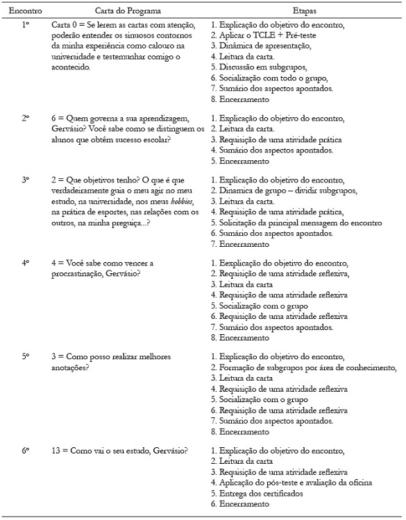 As atividades do programa ocorreram em encontros com duração de 90 minutos, realizados semanalmente, de forma ininterrupta, totalizando seis encontros. Foram padronizados em termos de sequência de atividades, materiais utilizados, presença de uma auxiliar e da coordenadora. A auxiliar, pesquisadora da teoria social cognitiva, contribuía com a entrega e recolha dos materiais, orientação e acompanhamento de alguns subgrupos, além de oferecer uma síntese do ocorrido ao final de cada encontro. O procedimento de cada encontro ocorreu, de forma geral (Figura 1), conforme sugestão dos autores do Programa. As etapas são: leitura da carta, discussão em subgrupos (socialização de dúvidas e/ou vivências dos próprios alunos) disparada por alguma atividade direcionada, socialização em plenária e síntese feita pela coordenadora sobre o tema tratado (Rosário; Núñez, & González-Pienda, 2012; Freitas-Salgado, 2013). No momento “leitura da carta”, a carta escolhida por encontro era lida. Dessa forma, as seis cartas utilizadas, serão mencionadas tal como foram apresentadas aos estudantes: primeiro encontro = carta 0; segundo encontro = carta 6; terceiro encontro = carta 2; quarto encontro = carta 4; quinto encontro= carta 3; sexto encontro= carta 13 (Figura 1).