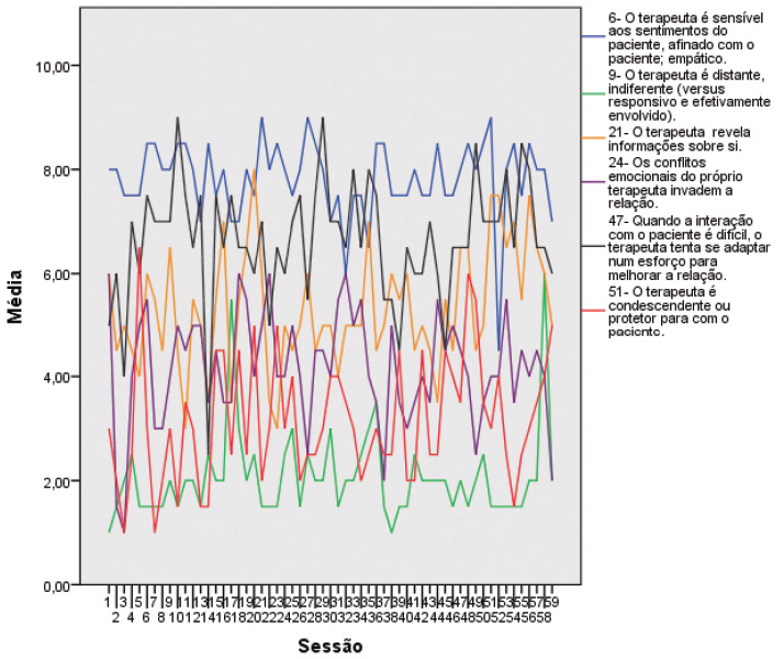 Conforme pode ser visualizado na figura 1, ao longo do processo, a terapeuta mostrou-se sensível e empática aos sentimentos da paciente (Q6) em todas as sessões (exceto na sessão 52), e responsiva e efetivamente envolvida (Q9R). Quanto ao fato da terapeuta revelar informações sobre si (Q21), houve variações: em algumas sessões esta atitude foi característica e em outras, não característica. Este item foi classificado como “razoavelmente característico ou saliente”, nas sessões 16, 20, 35, 51, 52, 54 e 56. A maior classificação no extremo não característico foi obtida na sessão 11 e 23.