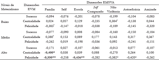 Realizaram-se correlações entre as três dimensões da EVM e as sete dimensões da EMSVA. Os resultados indicaram uma correlação inversamente proporcional entre o fator Felicidade da EVM e os fatores Família (r = -0,442, p < 0,001) e Escola (r = -0,245, p < 0,001) da EMSVA. O nível de materialismo dos participantes foi obtido dividindo-se o valor total de materialismo da amostra em quartis. O quartil inferior agrupa os participantes com níveis baixos de materialismo com escores iguais ou inferiores a 27 (28% da amostra). No segundo quartil, estão os participantes com níveis médios de materialismo com escores entre 28 e 31 (52% da amostra). Por fim, o quartil superior reúne os participantes que apresentam níveis altos em materialismo com escores iguais ou superiores a 32 (20% da amostra). As correlações mais significativas (p < 0,05) entre os níveis de materialismo e os níveis de satisfação de vida foram encontradas em relação aos participantes do quartil superior da escala EVM, altos em materialismo. Nesse grupo, os resultados apontam para correlações inversamente proporcionais mais robustas (considerados valores acima de r = 0,40) entre Felicidade (pela aquisição de bens materiais) e a satisfação com a família e com a escola. A Tabela 1 mostra estas correlações.
