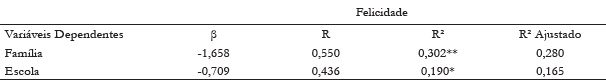 Considerando as correlações encontradas, foram realizadas análises de regressão simples tendo como variáveis dependentes as dimensões Família e Escola da EMSVA e como variável preditora a dimensão Felicidade da EVM. Utilizou-se o método Enter. O ajuste do modelo foi verificado por meio do teste de Hosmer-Lemeshow. A Tabela 2 mostra os resultados dos modelos de regressão que tiveram maior percentual de variância explicada e tiveram significância estatística associada significativas (p < 0,05). Felicidade é responsável por 30% da variância de satisfação com a família e por 19% da satisfação com a escola.