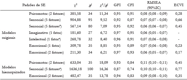 De modo adicional, optou-se por analisar se cada estrutura multidimensional seria melhor explicada de forma hierarquizada, ou seja, por um fator de segunda ordem, devido às correlações, de baixas a elevadas, existentes entre os fatores encontrados nos modelos multidimensionais (Psicomotor: r = 0,24; Emocional: r = 0,77; Sensorial: r entre 0,46 e 0,88). Nesse sentido, a variância do padrão Sensorial, por exemplo, seria explicada por cinco fatores, que corresponderiam aos cinco sentidos da escala. Estes poderiam constituir fatores de primeira ordem, cuja variância, por sua vez, seria explicada pelos respectivos itens. Nos casos dos padrões Psicomotor e Emocional, a variância seria explicada pelo fator de segunda ordem em cada escala. Foi possível observar que os índices de ajustamento dos novos modelos não são melhores que os de primeira (Tabela 1).
