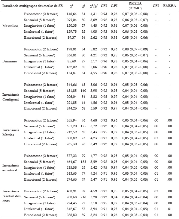 Embora tenham se constatado diferenças nas médias entre os sexos em algumas escalas [Psicomotor (Atividades físicas), Psicomotor (Atividades gerais), Sensorial (Olfato), Sensorial (Visão), Emocional (Interpessoal) e Emocional (Intrapessoal)], as AFCMG indicaram que as estruturas fatoriais de todas as ESE são equivalentes para ambos os grupos. Foi possível observar que as ESE apresentam, portanto, invariância configural (igualdade de forma), métrica (igualdade nas saturações dos itens nos fatores), estrutural (igualdade de variância ou covariância das variáveis latentes) e residual dos itens (igualdade dos erros dos itens) quanto ao sexo dos participantes. Esses resultados sugerem que as ESE podem ser aplicadas e, principalmente, interpretadas em sua estrutura indistintamente em meninos e meninas.