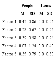 Thus, category 2 is not the most likely in any region of theta and category 4 is the most likely in a very narrow region of theta, therefore both are underutilized by subjects in Factor 1. However, a similar situation occurs in the other factors, suggesting that categories 2 and 4 could be collapsed, respectively, with categories 1 and 5, using only three categories of response in the instrument as a whole.