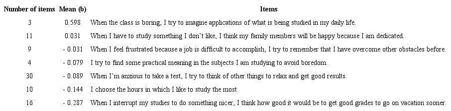 Based on these item content analyzes, we can identify the elements that produce changes in the level of skill required for the respondent to agree with the item. In general, it was observed that emotion regulation becomes more difficult as the necessary actions go from the modification of elements in the environment to the modification of internal dispositions and, finally, to anticipation and taking the necessary measures to avoid the problem. Even at the internal level, solutions such as diverting the focus of thought from the task being performed are easier because, in a way, they lead the subject to think of situations external to the one he is experiencing and in extrinsic motivations, while the reinterpretation of the situation with a focus on learning is more difficult.