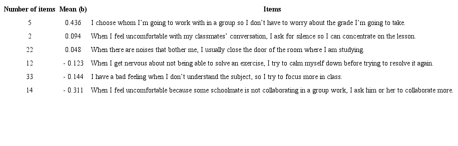 Latent trait analysis was performed by observing the content of the items when placed in decreasing order of intensity in the construct (b). Table 2 shows the difficulty parameters of the items that compose Factor 1 (Change in the situation/ focus of attention).