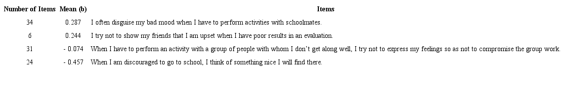 Finally, Factor 5, response modulation, is also composed of items that describe a strategy compatible with the theoretical proposal of Gross (2008). Item 24 was the easiest because it deals with a generic situation, which involves overcoming inertia to go to school. Items 6 and 31 are about containing the expression of some negative feeling toward peers, and 34 seems to be the most complex because it involves not only the containment of the expression, but the disguise, that is, the production of an expression that is not compatible with the internal physiological state, but that would be more appropriate from the social point of view. This factor was also obtained in previous studies, which show that emotional suppression is a strategy for regulating emotions that produces negative effects on healthy mental and interpersonal functioning (Gross & John, 2003; John & Gross, 2004).