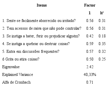 The Hostility Subscale (HS), certified for Brazil by Laloni (2001), is included in the Symptom Cheklist - 90 - SCL - 90 (Derogatis, 1975) and aims to select people with or without psychiatric intervention. As for the Hostility Subscale it is composed of 6 items, whose scale of response varies from 1 = Never to 4 = Always. High scores point to a high level of hostility; in contrast, low score indicates a lower level of hostility. Regarding the psychometric aspects, the reliability of this subscale in the original study was 0.84; and the temporal stability was 0.78 (Derogatis et al., 1976). It was observed, in its Brazilian version, a good internal consistency index of 0.79 (mean correlation of 0.40) and correlation coefficient of test-retest accuracy in the 7 to 15 days period was 0.79 (Laloni, 2001).