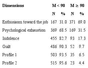 The database was analyzed on PASW statistical package, version 17 (SPSS/PASW, Inc., Chicago, IL). First, descriptive analyses of exploratory nature were carried out in order to assess, on the database, the distribution of the items, missing cases and identification of extremes. To calculate prevalence, cutout points present in the instrument’s manual were used (Gil-Monte, 2011). The calculation of Burnout Profile 1 considered the mean of all 15 items of enthusiasm toward the job (inverted), psychological exhaustion and indolence subscales, and, for Profile 2, the guilt dimension was added (Gil-Monte, 2005, 2011; Gil-Monte, Carlotto, & Câmara, 2010).
