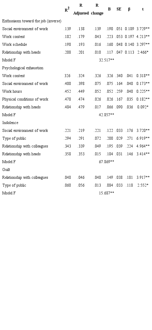 Indolence was explained in 35.3% by perception of the social environment of work, type of public, relationship with colleagues and heads as stressors, with social environment of work variable being that with the highest explanatory power (21.9%). Perceiving these work situations as stressful strengthens the behavior of indifference and detachment in relations. Finally, the regression analysis for the dependent variable guilt revealed as predicting variables the relationship with colleagues and type of public stressors, with 5.6% of the variance, and with the relationship with colleagues variable accounting for 4.6% of the explanation of the dimension. This result indicates that with an increase in the perception that the relationship with colleagues and the type of public served are stressful, there is an increase in the feeling of guilt due to the perception that the servant does not meet the social expectations of his role.