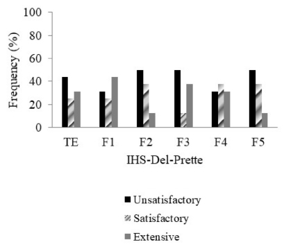 In addition to the Total Score (n = 7), three factors were considered critical: F2, self-assertion in the expression of positive feelings (n = 8); F3, conversation and social resourcefulness (n = 8); and F5, self-control of aggressiveness (n = 8), in accordance with the IHS-Del-Prette reference sample. Clearly, the majority of the sample reported an extensive repertoire for F1 (confrontation and self-assertion with risk), despite a significant number classified as unsatisfactory.