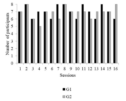 Participation in G1 ranged between 75% (n = 6) and 100% (n = 8). In G2, the frequency ranged from 62.5% (n = 5) to 100% (n = 8). Comparing these results between the groups, the Mann-Whitney test did not indicate a significant difference (U = 120.0, z = -0.324, p = 0.746). In general, high attendance was observed in both groups during the program.