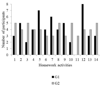Another important indicator in the process evaluation was the inspection of the homework activities (HAs) assigned at the end of each program session. Figure 3 shows the number of participants who completed each of the 14 HAs.