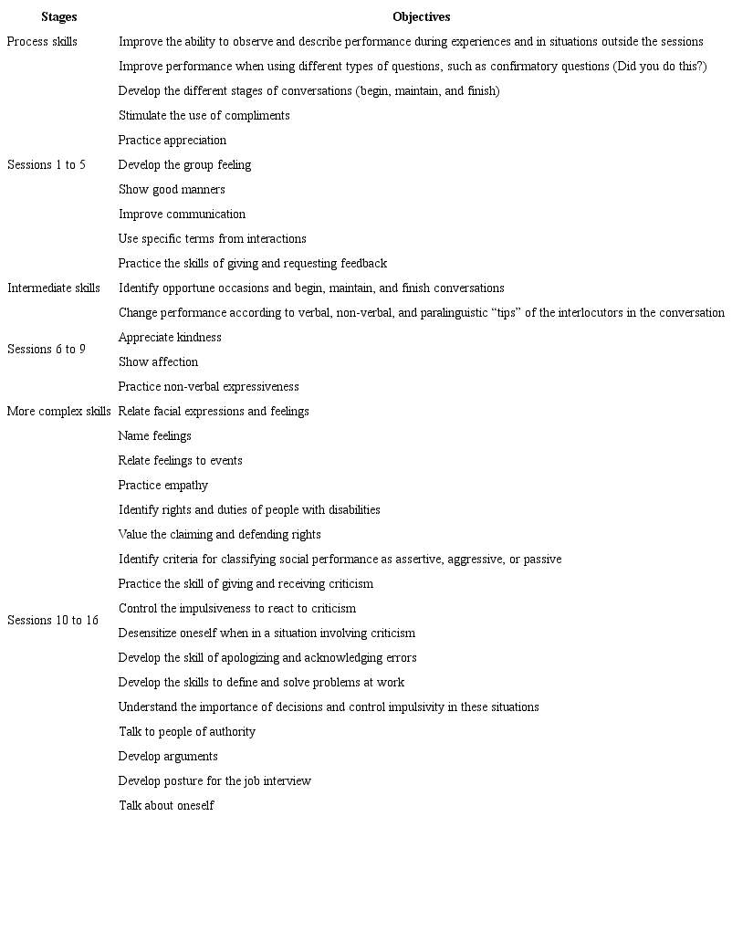 Despite the importance of promoting social skills for people with physical disabilities, no specific intervention for this population was identified in the review conducted by Murta (2005) of the national production of training programs with Brazilian samples in the area. In the national literature, there remains a shortage of interventions aimed at the development of social skills among people with physical disabilities (Azevedo & Costa, 2018). In the international literature, it is possible to identify many studies on people with disabilities preparing for work (Lindsay et al., 2012; Phillips et al., 2014; Soresi & Nota, 2000), and there are also investigations monitoring the teaching objectives of these programs. Generally, the practices are more focused on basic skills (e.g., clothing, hygiene, punctuality, and frequency) than on more complex social skills such as cooperation and control of emotions (Chu & Zhang, 2015). Additionally, the data available in the literature show SSPs with different populations and diverse arrangements, including interventions of just a few days or several years in duration, in individual or group formats, and conducted in therapeutic environments or natural work situations (Campos & Almeida, 2010; Phillips et al., 2014; Tripney et al., 2017). Despite the heterogeneity of the interventions, even in the international literature, it is difficult to identify research that evaluates SSPs for people with physical disabilities who are searching for employment (Tripney et al., 2017).
