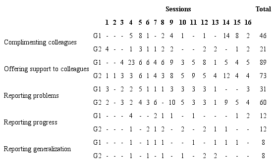 The comparison between the two groups indicates that the results were similar in these indicators, with the exception of “reporting problems” (U = 75.000, z = -2.039, p = 0.041), which was higher for G2. The data show that “reporting problems” recurred throughout the sessions for both groups, and from the fourth session onward, the continued presence of the other indicators - particularly “complimenting colleagues” and “offering support to colleagues” - characterized a welcoming environment in both groups. It was also clear that the reports of progress and generalization began to occur even before the halfway mark of the sessions, which suggests that the participants were learning to observe themselves and situations in the natural environment in the early stages of the intervention.