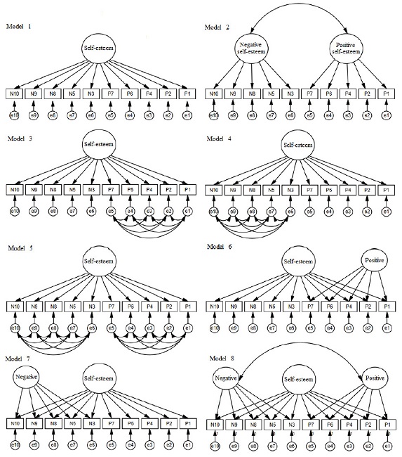 We tested the fit of eight factorial solutions for the RSES, presented in Figure 1. Model 1 is a single-factor solution while Model 2 represents a structure with two correlated factors, when dividing the items between positive self-esteem and negative self-esteem. Models 3 and 4 represent a single-factor structure of the RSES with the measurement errors correlated between positive items (Model 3) and between negative items (Model 4). Model 5 denotes a unifactorial structure with measurement errors correlated simultaneously between positive items and between negative items. Models 6 and 7 represent a unifactorial structure in which the method effect is controlled via a latent factor associated with the positive items (Model 6) and negative items (Model 7). Finally, Model 8 denotes a unifactorial structure with correlated latent factors to control for the method effect in the positive and negative items simultaneously.