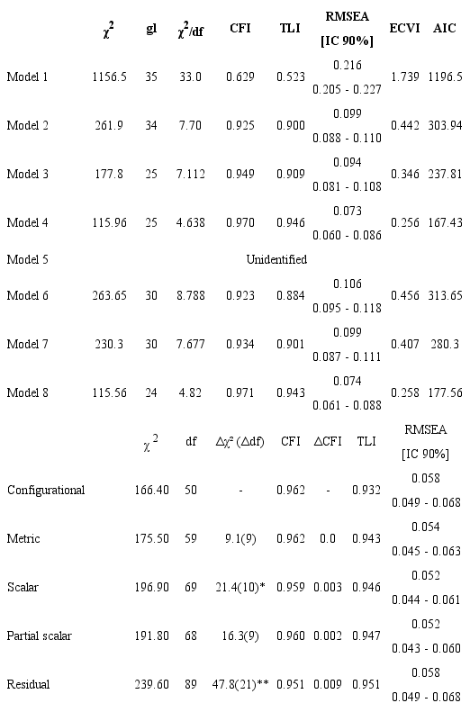 Finally, in relation to the models that controlled simultaneously (Models 5 and 8) for the effect of the positive and negative items, Model 5 was an unidentified model, as also observed in other studies (Michaelidis et al., 2016; Vasconcelos-Raposo, Fernandes, Teixeira & Bertelli, 2012; Supple et al., 2012; Wu et al., 2017). Due to the absence of non-significant correlations between the errors observed in Models 3 and 4, it was not possible to respecify Model 5, as proposed by Tomás and Oliver (1999), who recommended setting the non-significant correlations of unidentified models at zero. Therefore, Model 5 was excluded from further analysis. In turn, Model 8 presented adjustment indices considered good in the literature, although these indices were similar to the Model 4 indices, which had the best fit among the eight models tested. The value of Cronbach’s alpha for global self-esteem was 0.82.