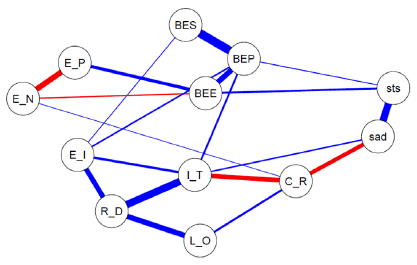 Por fim, os resultados da análise de rede ponderada são apresentados na Figura 1. Cada círculo representa uma variável, enquanto as linhas representam as relações entre elas, que podem ser positivas (azul) ou negativas (vermelho). A espessura indica a magnitude da associação.