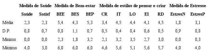Inicialmente, para atingir os objetivos propostos, a estatística descritiva dos resultados nos instrumentos foi estimada. Os resultados são apresentados na Tabela 1, a seguir.